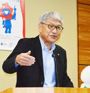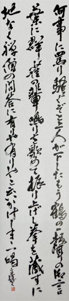 山本さんの入賞作品は調和体(漢字かな混じり)で、幸田露伴の小説「五重塔」から70文字を225×53㌢の用紙に書いた。昨年12月から制作に取り組み、今年3月初旬まで3カ月かけて完成させた。「五重塔」は明治25年に文豪幸田露伴が書いた小説で、五重塔の建立を巡る職人の葛藤の物語。山本さんは文字のバランスのいい部分を選んで書いた。字間を詰めて行間に余裕を持たせ、美しい流れを生み出すように心がけたという。「ずっと目標としていた賞なのでとてもうれしく思うと同時に、受賞者としての責任を感じ、身の引き締まる思いです。2度目の入賞を目指して、精進していきます」と話している。