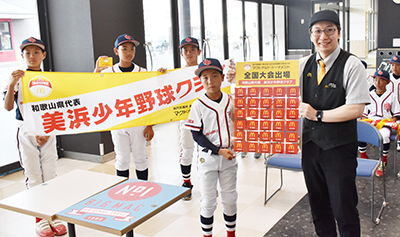マクドナルド42号御坊店の平野宗市店長が「県大会優勝は日ごろの練習の成果のたまもの。全国でも悔いのないよう精いっぱいプレーしてください。応援しています」と激励し、山西雄大主将(和田小6年)らにワッペンが入ったボードや横断幕などを手渡した。