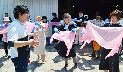 御坊市藤田町北吉田のハス池公園を運営するNPO法人北吉田蓮の郷の開園10周年記念イベントの染色体験会が29日、蓮の郷近くの倉庫で開かれ、午前の部には主婦やスタッフら合わせて30人が参加した。