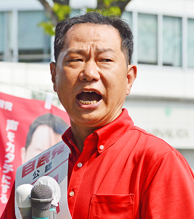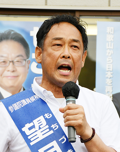 新人7人乱立の参議院議員選挙和歌山選挙区は各陣営が県内各地で街宣を行っており、日高地方でも保守分裂戦を演じる無所属の望月良男候補(53)が公示日の3日、自民党の二階伸康候補(47)が翌4日、御坊市で相次いで出陣式を行い、必勝を期して気勢を上げた。望月候補は「希望ある未来へ」、二階候補は「地方の声を国政に反映」などと、熱弁をふるった。