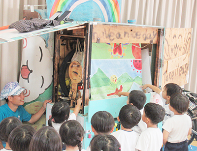 紀伊半島を南から北上中、同園にやってきた沼沢さんは、ホールで2~5歳児75人に「きみにあいに」という布芝居を披露。友達になったミミズ、タンポポ、雲の心温まるストーリーで、進行に合わせて音楽を流し、最後はシャボン玉を出した。