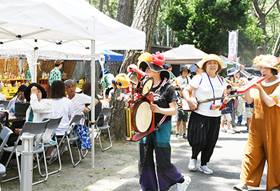来場時、短冊に願い事を書くと、ヨーヨーやアニマルバルーンがもらえ、子どもたちは大喜び。インチキマジシャンあきらさんのマジック、天音太鼓保存会の演奏、ゆらチンドン一座のパフォーマンスもイベントを盛り上げ、会場はビール片手にほおを赤らめる大人や汗を流してはしゃぐ子どもらで活気にあふれていた。