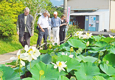 ダニエル氏は昨年、御坊舞妃蓮の会・和歌山大賀ハス保存会会長の阪本尚生氏からの提供で舞妃蓮の花や果托を使ったレセプションと展覧会を開いたことがあり、今年の作品へのイメージを膨らまそうと、舞妃蓮が咲いている様子をじかに見るため御坊に初めてやって来た。ハス池では阪本さんやハス池を管理する北吉田蓮の郷の佐竹成公理事長らの案内を受け、淡いピンクの舞妃蓮の花が咲き乱れる光景に「ビューティフル」「ファンタスティック」と連発。「まるでバレリーナのようだ。私にとってハスは世界一美しい花」と感激していた。今回の作品は縦横4㍍の特大サイズで、御坊から提供する舞妃蓮を使ってハスの花びらを表現する。