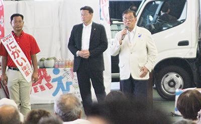 自民党総裁の石破茂首相が8日、参議院議員選挙和歌山選挙区に立候補している党公認の二階伸康候補(47)を応援するため、御坊市名田町のJAがいなポートで演説した。