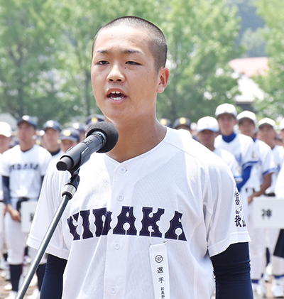 県高野連の西上嘉人会長が開会あいさつ。選手宣誓で湯川主将は「日高高校は昨年、100周年の節目を迎え、先輩たちの歩みを知りました。大会を通し、先輩から受け継いだ情熱や思いを未来の高校球児につなぎます。先輩方が積み上げてきた歴史と私たちに関わってくださった全ての人に感謝、全力でプレーし、全国で一番熱い大会にすることを誓います」と力を込めた。