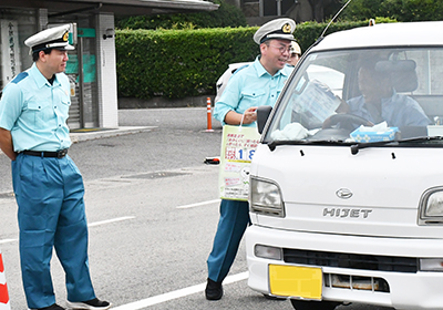 わかやま夏の交通安全運動が11日から始まり、由良町では交通指導員らが網代の県道沿いで啓発活動を行った。