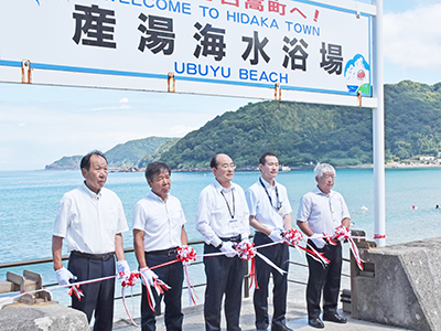日高町の産湯海水浴場が12日オープンし、初日には式典やテープカットが行われた。
