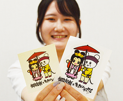 市が作成した今回のオリジナルシールは両手を広げ笑顔のみーやちゃんと、番傘をさす時代衣装のネズミくんがデザインされており、「御坊市×キュウソネコカミ」の文字も入っている。縦8㌢、横7㌢と縦9・8㌢、横8・5㌢の2つのバージョンがあり、各5000枚を作製。御坊のPRや市民の愛着につなげてもらおうと市外でのシティプロモーション活動や地元イベントでのアンケート調査の際に配布する。