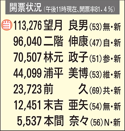 参議院議員選挙が20日投開票され、和歌山選挙区は無所属新人の望月良男氏(53)が11万票以上を獲得して保守分裂戦を制し、堂々の初当選を飾った。望月氏は世耕弘成衆議院議員の全面支援を受けて自民支持層や無党派層から幅広く集票し、世耕氏の参院議席を継承。一方、自民党新人の二階伸康氏(47)も善戦及ばず、昨年秋の衆院選に続き、父俊博氏の国政のバトンを引き継げなかった。参政党新人の林元政子氏(51)は全国的な党人気の風を受けて22年の前回選挙から躍進。日本維新の会新人の浦平美博氏(53)、共産党新人の前久氏(69)、無所属新人の末吉亜矢氏(54)、NHK党新人の本間奈々氏(56)も巻き返しを狙ったが、届かなかった。