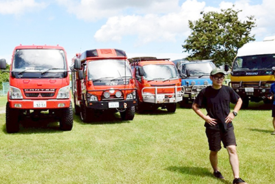 御坊市野口オートキャンプ場で19、20日、災害対応型オフロードトラックの愛好家が集うミーティングin和歌山が開かれ、全国から16台の「高床四駆」が集結した。