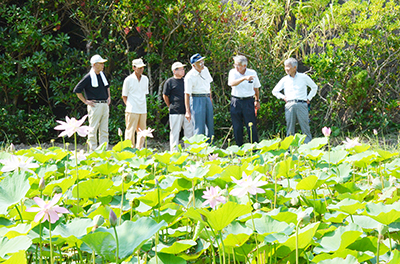 1962年、阪本会長の父で「ハス先生」と親しまれた故阪本祐二さん(御坊市)と大賀一郎博士の縁で同池に大賀ハスが分根され、65年に同会が発足。大賀ハスだけが生育する池は全国でも数少ない。