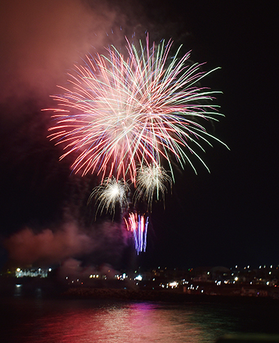 南部海岸や鹿島神社周辺には家族連れや浴衣姿のカップルら多くの人が集まり、花火が打ち上がると歓声がわき起こった。澄んだ夜空に色とりどりの大輪の花が咲き、いろんな形の花火が上がると「あ、ハートマーク」「クラゲや!」など子どもたちのかわいい声が響いた。クライマックスは大小さまざまな花火が夜空に咲き乱れた。