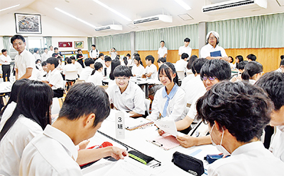 最後にこれまでの講義や発表を踏まえ、自分たちにできることについてグループに分かれて意見交換。生徒たちは「家族でハザードマップを確認したり、避難経路を話し合う」「避難経路は複数パターンを考えておく」「防災バッグを用意する」「普段から地域の高齢者との交流を深めておく」「今日学んだことを多くの人に伝える」など次々と意見を出し合い、最後は各グループが順番に発表した。