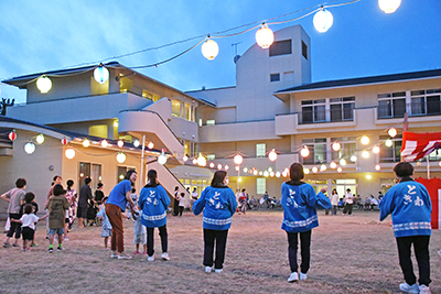 野尻直克施設長が地域への感謝を伝え、施設東の広場でやぐらを囲んで盆踊りがスタート。職員や参加者がちょうちんの明かりのもとで輪をつくり、「炭坑節」や「ドラえもん音頭」「河内音頭」などを踊った。
