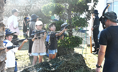 会場では子ども向けの催しが行われ、水鉄砲ではボードで作った的のほか、敵役の隊員も登場。ボードに隠れておもちゃの手りゅう弾を投げるなどの反撃もあり、子どもたちは大喜びで水を浴びせていた。