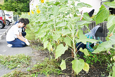 ボランティアは希望者が学校や町内施設等で活動。保健福祉総合センターでは町ボランティア連絡協議会のメンバーとともに、花壇の草取りや地下駐車場の掃除、窓ふきを行った。草取りでは軍手に鎌を持ち、爽やかに汗。「いいことをしようかなと思って」と毎年参加しているという西森大翔君(3年)は、「気持ちがいいですね」と笑顔を見せていた。