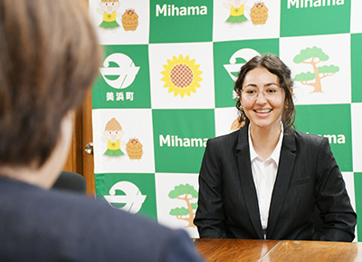 カリフォルニア州プレザントン出身。3日に来日し、美浜町の印象について「とてもきれいなまち」と笑顔を見せた。