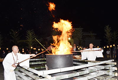 さまざまな理由で亡くなった新生児や胎児の魂を供養する会で、毎年開いている。午後7時から水子地蔵の前で法要を行ったあと、グラウンドで焼き供養。中央に設置された大きなかまに卒塔婆(経文が書かれた木片)を次々と投入し、燃え上がる炎の周りで婦人部が御詠歌を唱え、参列者は手を合わせて冥福を祈っていた。