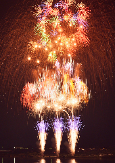 歩行者天国の日高川堤防道路には多くの露店が出店され、道路を埋め尽くすほどの人だかり。カウントダウンとともに約3000発の花火が始まり、鑑賞玉20連発や3カ所からの乱れ打ちに大きな歓声が上がっていた。今年は上空に風がほとんどなかったため、煙が移動するのをしばらく待って打ち上げるなど工夫。ラストのワイドスターマインは10カ所から次々と打ち上がる色とりどりの大輪が夜空を焦がし、見物人は過ぎ行く夏を惜しんでいた。