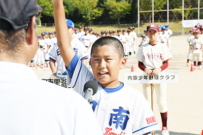 開始式には出場12チームのうち、前年優勝の美浜、準優勝の上南部、選手宣誓の印南黒潮、開幕試合の内原、河南、印南ファイターズ、藤田の合わせて7チームが参加。整列したナインを前に日高支部の田渕稔学童部長、JAわかやま紀州地域本部共済部共済普及課の坂田圭課長があいさつでエールを送り、JA共済連和歌山から参加賞贈呈の後、廣野主将は「日ごろの練習成果を発揮し、悔いの残らないよう大好きな野球を全力でプレーし、6年生最後の思い出にしたい。いつも指導してくれている監督、コーチ、支えてくれている家族に恩返しできるよう、勝っても負けても野球ができることに感謝しながら、心から楽しむことを誓います」と熱戦の火ぶたを切った。